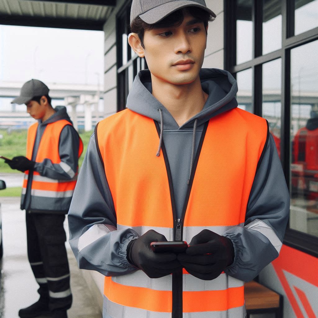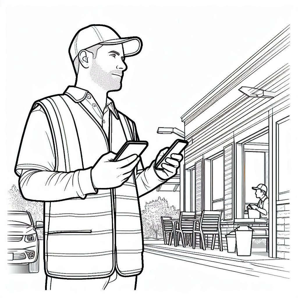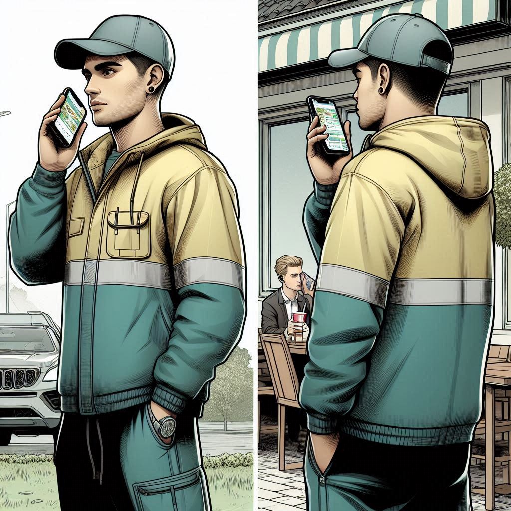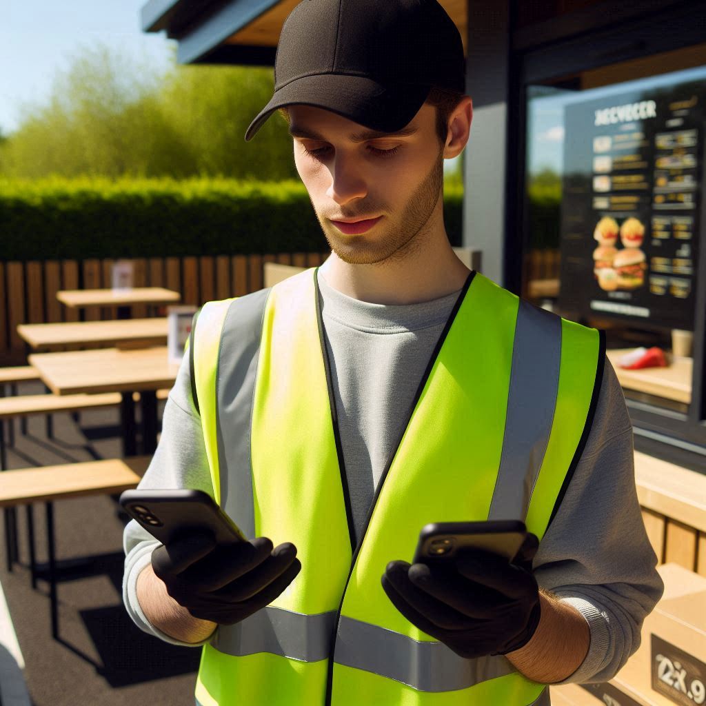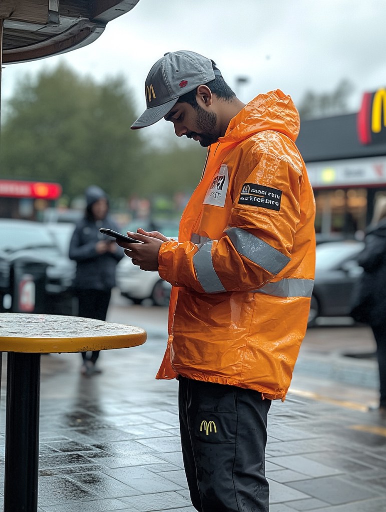 My first attempt at a prompt was based on the above picture; ‘photo of a sad Deliveroo employee looking at his mobile phone. He is stood in front of a drive-through fast food restaurant. It is sunny and bright’. Here are some of the initial outputs: